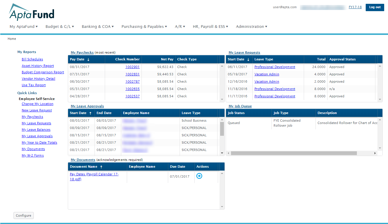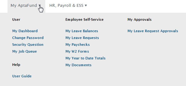 When you login as an approver, you'll see additional features in the Home window, and the My AptaFund menu. In addition, you'll see the Employee Self-Service menu under the Payroll, H/R & ESS heading.