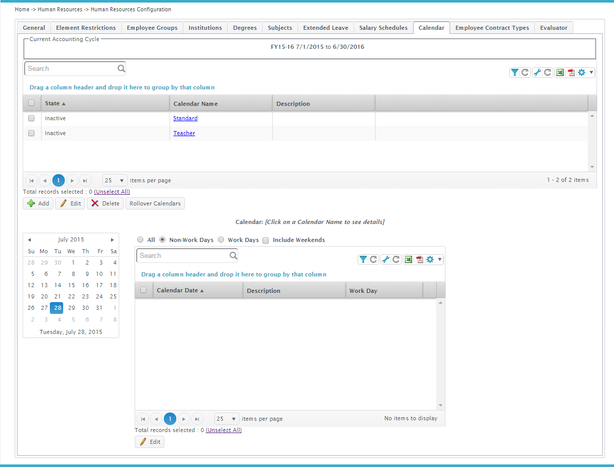 Enter additional non-working days, like holidays and additional days off, for each calendar in the new fiscal year. Click here for instructions.
