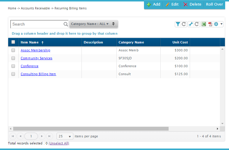 Use recurring billing items to create similar bills for many customers. A recurring billing item is linked to a single category and has default cost and account information that can be overridden when the item is added to an invoice.