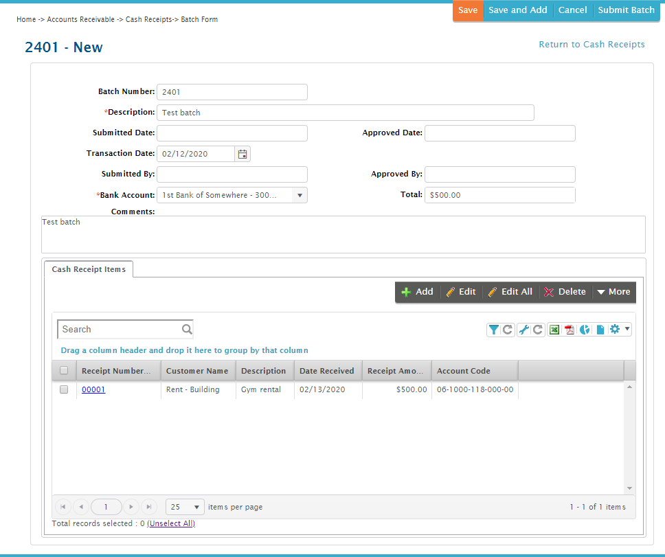 Click Save when finished, and the receipt is saved to the batch and displayed in the Cash Receipt Items grid. Or click Save and Add to enter additional receipts.