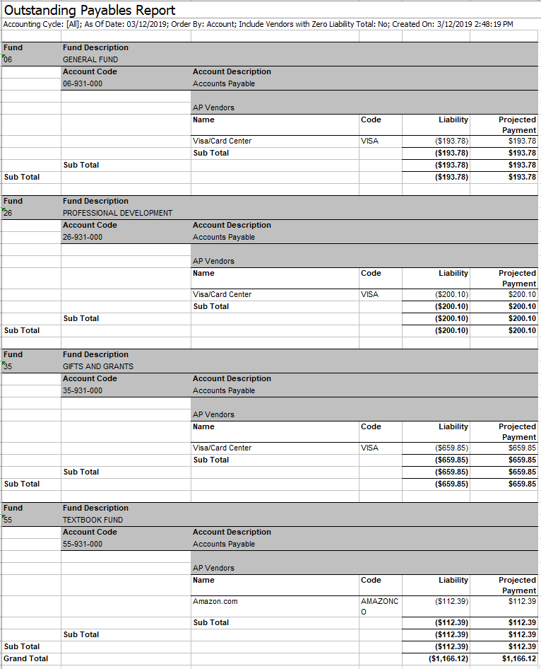 The Outstanding Payables Report lists outstanding payables by account or vendor for the selected accounting cycles.