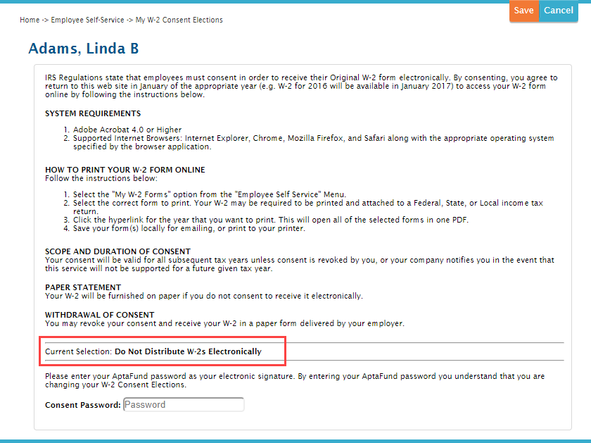 Select My W-2 Consent Elections from the My AptaFund > Employee Self-Service menu, and the My W-2 Consent Elections window opens. Note that your current selection is indicated toward the bottom of the window.