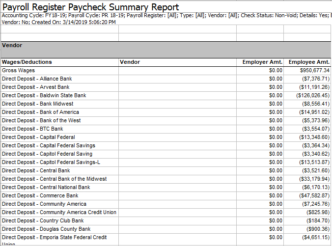 Summary: Employer & employee amounts for gross wages, direct deposits, and all deductions, sorted by vendor.