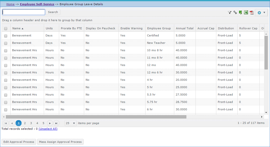 Use the Employee Group Leave Details window to link an approval process to each of the different leave types. This window displays the group leave details set up in Payroll Configuration on the Leave Types tab.