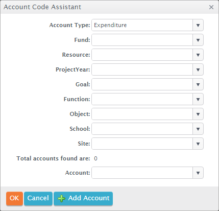 Use the drop-down lists to select parts of the account code. As you make selections, you can see how many accounts fit the criteria in the Total accounts found are: field. Example