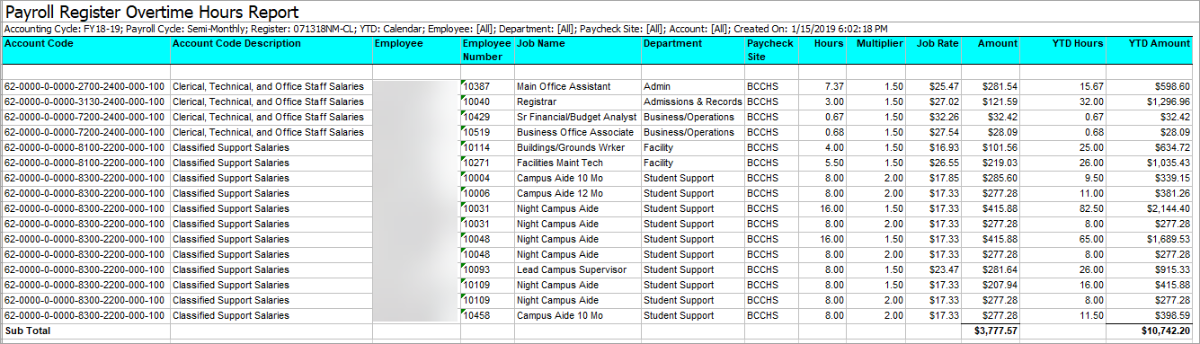 Fields included on the report are: account code, employee name & number, job name, department, paycheck site, overtime hours, multiplier, job rate, overtime pay amount, YTD hours, and YTD amount.