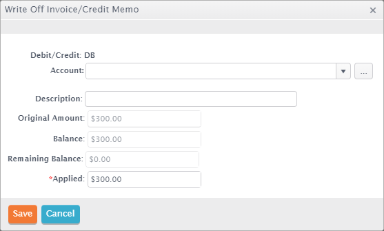 Check the box for the invoice, and click Write Off Balance. The Write Off Invoice/Credit Memo window opens.